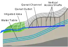 Qanater bygges som en serie af brøndlignende skakte, knyttede til hinanden ved hjælp af så vidt svage tunneler. Qanater tapper underjordisk vand på en måde, som effektivt leverer store mængder vand til overfladen, uden behov for pumpning. Vandet drænerer ved hjælp af tyngdekraften, med destination på et lavere liggende område end kilden, som vanligvis er et højereliggende grundvandsmagasin. Qanater gør det muligt at transportere vand over lange afstande i varme, tørre klimaer uden at tabe en stor procentandel af vandet gennem nedsivning og fordampning.