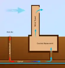En kareze kan også anvendes til at levere køligere luft i bygninger og boliger ved at lede luften fra karezen op gennem strukturen og fordampe noget vand - og lede luften ud af en åbning modsat vindretningen via et vindtårn. I ørkenområder kan det give en køling på mere end 15 °C i forhold til kareze luften. Denne køleteknik har været anvendt i mere end 1000 år.[11]