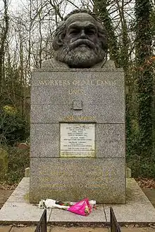 Inskriptionen på støtten, et monument rejst i 1954 af Det britiske kommunistpartiet, er "Workers of all lands, unite!". Den oprindelige gravsten var i udgangspunktet beskedent udsmykket.