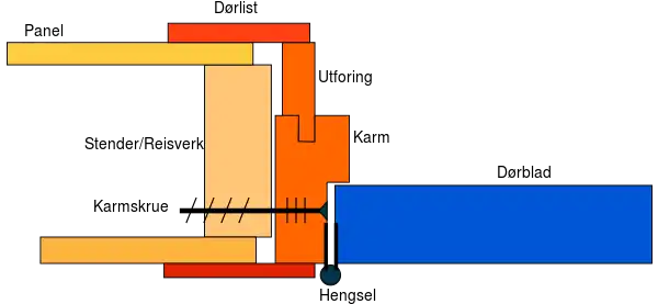 Tegning af en dør bestående af blandt andet dørblad og dørkarme.