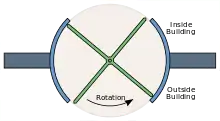 Diagram af en karruseldør, set ovenfra.