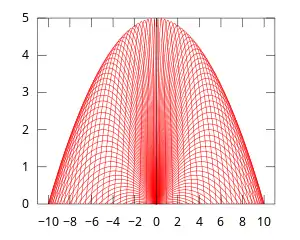 Hvis et projektil kan sendes afsted med en maksimal startfart, men med forskellige vinkler, er der et helt område i -planet, som kan rammes af projektilet. Dette område er afgrænset af kasteparablens indhylningskurve.