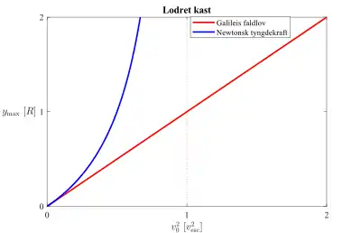 Betydningen af Newtonsk tyngdekraft er lettest at vise med et lodret kast. Ligning 1 kan udledes ved at sætte den kinetiske energi i starten til at være lig ændringen i potentiel energi fra start til top. Derved fås: