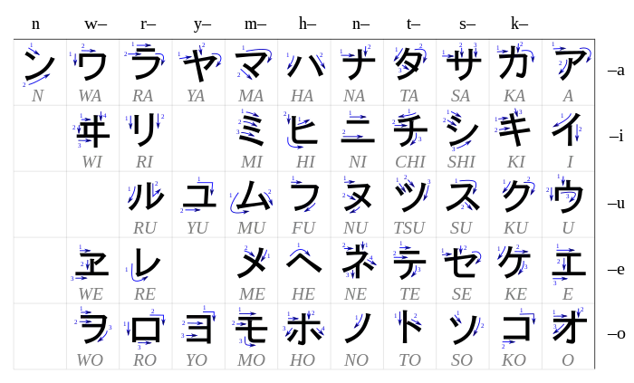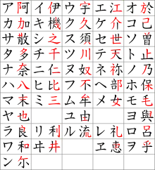 Denne tabel viser katakana-tegnene og de tilsvarende læsemåder med latinske bogstaver efter systemet Modificeret Hepburn. Transkriptioner i rød er forældede, mens transkriptioner i grøn er moderne tilføjelser, der hovedsageligt benyttes til at repræsentere udtalen af fremmede sprog. Katakana kan ofte være svært at lære, da visse tegn ligner hinanden meget. shi シ og tsu ツ eller so ソ og n ン adskiller sig for eksempel kun ved forskelle i stregens retning. Det er et problem, der især gælder på tryk, mens forskellene ses tydeligere i håndskrift.