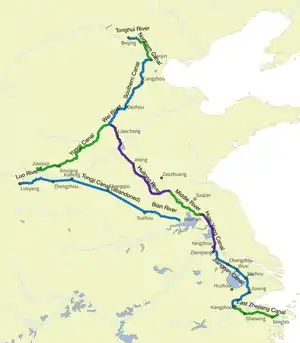 Kanalafsnittet Guangtongqu knyttede i 584 hovedstaden Chang'an 584 til Wei He og dermed til Den Gule Flod, mens Tongjiqukanalen (også kaldt Bianhe) i 605 knyttede området omkring Luoyang til floden Huai Hes nedre løb. Derfra knyttede Shanyangdukanalen i 606 nutidens Huai'an til Yangtze ved Yangzhou, mens Jiangnanhe i 610 løb derfra sydover til Hangzhou. I nord fik man i 608/09 Yongjiqu som skabte kanalforbindelsen til området omkring Beijing. Under Tang-dynastiet kom en del nye strækninger til, som for eksempel Guangjiqu ved Huai'an (742).
