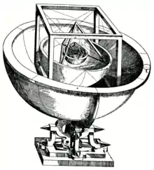 Johannes Keplers første større astronomiske værk, Mysterium Cosmographicum ("Det Kosmografiske Mysterium"), blev først udgivet som forsvar for det kopernikanske system. Kepler hævdede at have haft en åbenbaring 19. juli 1595, mens han underviste i Graz og demonstrerede Saturn og Jupiters konjunktion i dyrekredsen; han indså, at regulære polygoner har en indskreven og en omskreven cirkel i bestemte forhold, hvilket han mente kunne være universets geometriske basis. Efter ikke at have kunnet finde et unikt arrangement af polygoner, som passede ind i kendte astronomiske observationer (selv med ekstra planeter føjet til systemet), begyndte Kepler at eksperimentere med tredimensionelle polyedre. Han fandt frem til, at hvert af de fem platoniske legemer unikt kunne indskrives og omskrives af sfæriske kugler; at lægge disse legemer, hver indkapslet i en sfære, inde i hinanden ville give seks lag, hvilket svarede til de seks kendte planeter — Merkur, Venus, Jorden, Mars, Jupiter og Saturn. Ved at ordne legemerne korrekt — oktaeder, ikosaeder, dodekaeder, tetraeder, terning — fandt Kepler, at sfærerne kunne placeres i intervaller, der (indenfor de begrænsninger for nøjagtighed som datidens astronomiske observationer havde) svarede til de relative størrelser på hver planets vej, forudsat at planeterne kredsede om Solen. Kepler fandt også en formel som omhandlede størrelsen på hver planets kugle relativt til længden på dens omløbstid: fra inderste til yderste planeter er forholdet af stigning i omløbstid det dobbelte af forskellen i kugleradius. Kepler afviste dog senere denne formel, fordi den ikke var præcis nok.[6]