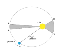 Hvis en planet fx bruger en dag på at bevæge sig fra punkt A til B, vil linjerne fra solen til A og B som vist i figuren, udgøre en vinkelsektor. Keplers anden lov siger, at arealet af denne vinkelsektor vil være lige så stort som arealet af sektoren, som dannes mellem Solen og C og D, hvis det også tager en dag for planeten at bevæge sig fra C til D.