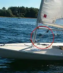 Bomnedhalets funktion er, at det bøjer masten bagover, så sejlet strækkes.