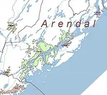 Byerne i Arendal kommune; Kilsund ligger mod nordøst, øverst til højre på kortet
