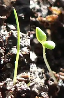 Kimplanter af Almindelig Solsikke. Bemærk kimbladene og kimroden (med tydelige rodhår).