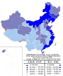 - All GDP per capita figures are according to the 2012 Statistical Communiqué of the provinces on National Economic and Social Development Arkiveret 6. september 2015 hos Wayback Machine, based on estimated GDP and mid-year population figures. The annual average exchange rate is CNY 6.3125 per US dollar; Købekraftsparitet (KKP) figures are according to April 2013 IMF data. CNY 4.18617 is equivalent to one Intl. $.