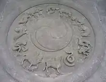 Dyrekredsen i den kinesiske astrologi, klokken 12 og med uret ses; Rotte, okse, tiger, kanin, drage, slange, hest, ged, abe, hane, hund og en gris.