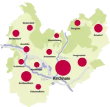 Ud over hovedbyen Kirchhain med ca. 8.300 indbyggere, fordeler yderligere 8.900 mennesker i 12 landsbyer og deres omgivelser: