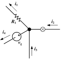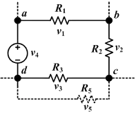 På figuren er fortegnene indeni variablene: V1,...,V4: V1+V2+V3-V4=0.