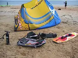 Mest almindelige til brug i vand er tubekites der skal pumpes op med luft, mens de såkaldte foilkites er de mest almindelige hos skiløbere. Mange nye kites fra 2007 har et SLE design, der bevirker at kiten kan neutraliseres eller opbremses hurtigt, hvis der sker noget uventet. Kitesurf er ikke specielt råstyrkebetonet, det kræver snarere teknik og balance. På billedet til højre ses tubekite, pumpe, board, trapez, hjelm, redningsvest, i baggrunden ses en kitesurfer med bom og liner.