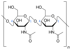 Det er et polysakkarid, der er opbygget i lange kæder af aminosukkerelementer (N-acetylglukosamin). Som ved cellulose bindes leddene sammen i β-1,4-bindinger.
