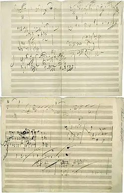 Ludwig van Beethovens håndskrevne skitse til Klaversonate Nr. 28, fjerde sats, Geschwind, doch nicht zu sehr und mit Entschlossenheit (Allegro). Stykket blev fuldendt 1816.