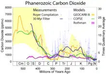 Over de seneste 600 millioner år har CO2-koncentrationen i atmosfæren varieret stærkt, fra omtrent >5000 ppm i nogle perioder til mindre end 200 ppm i andre, disse variationer har hovedsageligt været et resultat af geologiske og biologiske processer. Nylige studier af korrelationen mellem CO2-mængden i atmosfæren og klimaet de seneste 420 millioner år har vist at hurtige skift i koncentrationen af drivhusgasser i atmosfæren korresponderer med drastiske klimaændringer; herunder det termiske maksimum på paleocæn-eocæn-grænsen, den masseuddøen der fandt sted på Perm-Trias-grænsen og afslutningen på den Kryogene periode.[11]