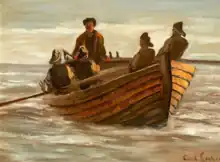 Carl Locher, Fiskere i klinkbygget robåd med sollys ind fra bagbord