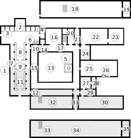 1. Kirke, 2. Presbyterium, 3. "Dødeport", 4. Sakristi, 5. Brønd i klostergård, 6. Trappe til dormitorium, | ||||||