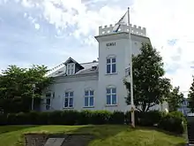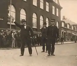 ![]() Knud Zimsen (t.v.) dirigerer i sommeren 1925 trafikken på Austurstræti i Reykjavík. | |