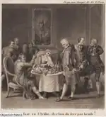"Hr. Peeckelhaerings våde læber viser hvordan han nyder en kande frisk øl fordi hans hals altid er tør" - Oplysninger fra en engelsk artikel om 'Peeckelhaeringh' - Benoît Audran den yngre (en), 1698-1772. Han har en onkel Benoît Audran den ældre (en), 1661–1721