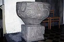 Den romanske døbefont af granit har dobbeltløver med menneskehoveder på kummen og hoveder på fodens hjørner.