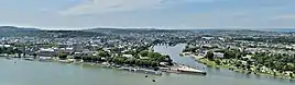 De to floder løber sammen ved landtangen Deutsches Eck, hvorpå der i 1897 blev bygget en 37 meter høj rytterstatue af kejser Wilhelm 1.