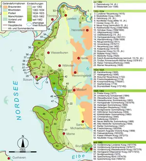 Den ældste frisiske bebyggelse i landskabet Ejdersted synes at være sket på stormflodssikrede værfter spredt ud over området, og de tidligste forsøg på inddigninger synes at være skete i umiddelbar tilknytning hertil for at muliggøre dyrkningen af brødkorn. Gradvist blev kogene indbyrdes forbundne ved nye inddigninger, hvorved landet fik en mere sluttet form, og de tidligere talrige afløbsskår og -render, der havde gennemskåret området, blev afskårede. Tilbage blev Heverstrøm med afløb mod nord, Eiderstrøm med afløb mod syd. Kogene indebar en usikker landvinding, og med tiden forsvandt flere sogne: Barnekemoor, Gammel Tetenbøl, Rembøl, Offenbøl, Ivenfleth, Marne, Syderhoved og Alversum.[1]