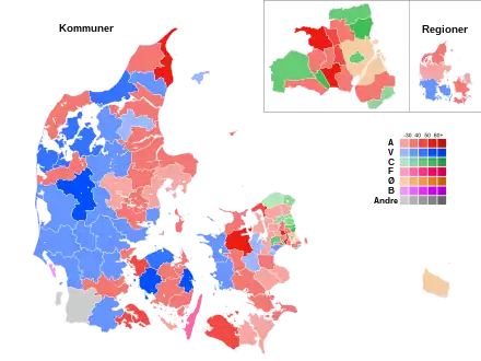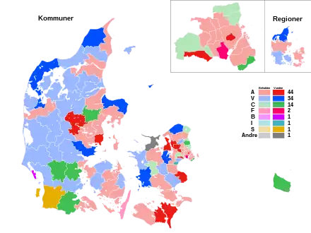 ↑Dansk Folkeparti blev valgt ind med 91 mandater i 71 kommuner, men efter at DF-profilen Lars Smith i Sorø fem dage efter valget skiftede til Det Konservative Folkeparti blev dette tal reduceret til 90 mandater i 70 kommuner.[19] Frederiksberg Kommune forhøjede antallet af medlemmer af kommunalbestyrelsen med 4 pladser fra 25 til 29.