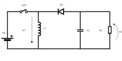 Kondensatoren C anvendes til at overføre energi og forbindes vekslende til input og til output af konverteren via kommutation af transistoren og dioden.