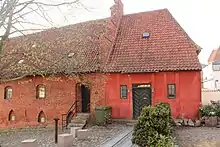 Ved den nordlige gavl er opført et bindingsværkshus.[4]