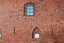 Dørene til kælderen i siden har spidsbuer med rundbuer inden i. Vinduerne er rundbuede.[4]