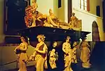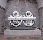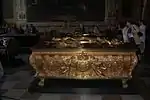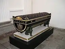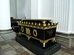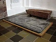 Nidarosdomen i Trondheim; selve graven er ikke blevet påvist ved udgravninger i kirken.[note 12] En mindetavle er sat op i Nidarosdommen for de ni konger, der er begravet i kirken, herunder Magnus den Gode.[25]  |