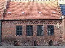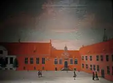 Tegning af Johannes Rach og Hans Heinrich Eegberg fra 1749. Yderst til venstre professorboligen fra 1730, i midten Konsistoriehuset og til højre for dette en lille rød renæssancebygning fra Christian IVs tid.