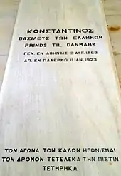 Den 11. januar 1923 døde Konstantin 1. af et hjerteanfald på et hotel i Palermo på Sicilien blot 54 år gammel. Han blev begravet på den kongelige gravplads ved Tatoi, den græske kongefamilies gravsted ved slottet Tatoi nord for Athen, hvor en stor del af kongefamiliens medlemmer ligger begravet.[1]