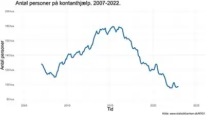 I 2008 var antallet af kontanthjælpsmodtagere på 199.000 personer – som modtog ydelsen i kortere eller længere tid og i 2010 var antallet af kontanthjælpsmodtagere på 172.400 personer. En opgørelse fra Arbejdsmarkedsstyrelsen i januar 2012, viste at 6.100 danskere havde haft kontanthjælp som eneste forsørgelsesgrundlag uafbrudt i de seneste 10 år.[17] I september 2012 modtog 170.483 personer kontanthjælp.[18]