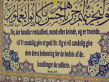 - Den anden danske oversættelse er fra 2006 og oversat af Ellen Wulff, som er mag. art. i filologi med arabisk som hovedfag og hebraisk og aramæisk som bifag. Hun er fra Københavns Universitet og Ph.d. i moderne arabisk sprog og litteratur fra Københavns Universitet 1998 (ISBN 87-91393-95-7).[9] Ifølge Mogens Müller er sproget 'klart og mundret og stillejet passende "bibelsk"'.[10]