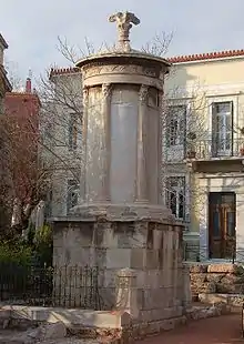 Mindesmærket efter Lysikrates, der var mæcen for opsætninger på Athens Dionysos-teater i 330'erne f.Kr, har seks korintiske søjler. [2]