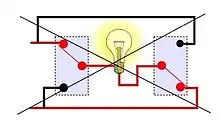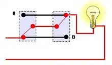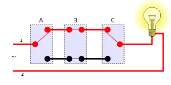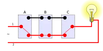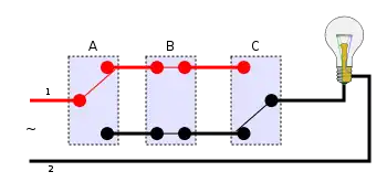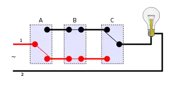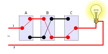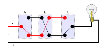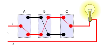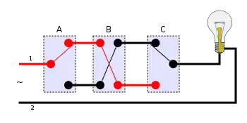 Ved C-korrespondance skifter hver omskifter mellem fase og nul. Når begge sider af pæren er forbundet til fase, er pæren slukket, samtidig med, at der er farlig spænding på pæren.