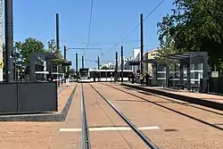 Letbanen ligger i en græsbelægning på midten ad Nyborgvej med stationen udfor pladsen og umiddelbart vest for krydset med Ørbækvej. Herfra drejer den mod syd ad Ørbækvej, som den ligger i den vestlige side af. Stationen består af to spor med hver sin sideliggende perron. I krydset er der desuden anlagt sporskifter i retning mod nord til Ejbygade.[4][5] Hvis det senere bliver besluttet at udvide letbanen med en etape 2, vil der kunne lægges spor herfra ad Ejbygade og gennem Vollsmose.[6]