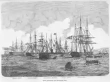 Danske Orlogsskibe paa Kjøbenhavns Rhed. Fra venstre til højre: Linjeskibet Skjold, Korvetten Dagmar, Panserbatteriet Rolf Krake, Korvetten Heimdal og Korvetten Thor. Samtidig illustration af krigen i 1864.