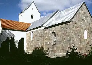 Kor og skib er opført i romansk tid af granitkvadre over skråkantsokkel. Begge portaler er bevaret. Den tilmurede norddør har trekvartsøjler med baser og kapitæler; søjler fortsætter som rundstav om det glatte tympanonfelt. Syddøren er bevaret i brug, den har ligeledes trekvartsøjler, dog er den østre søjle snoet, søjlerne fortsætter som rundstav om tympanonfeltet, der har en båndsløjfe i kraftigt relief.