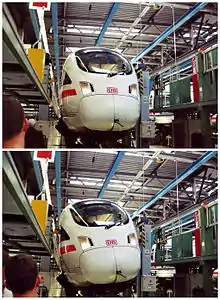 Sammenligning mellem ikke krænget (øverst) og krænget vognkasse (nederst) på ICE T