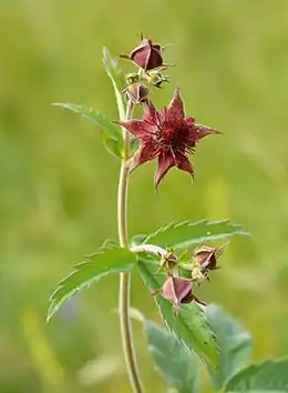 Blomstringen sker i juni-august, hvor man ser de endestillede, brune blomster. De er regelmæssigt 5-tallige og formet som potentilblomster. Frugterne er små nødder, som sidder forsænket i blomsterbunden.