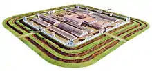 Allerede jæger- og samlersamfundene kendte til krigeriske sammenstød, men disse øgedes i antal og omfang i løbet af den neolitiske revolution, hvor bønder begyndte at dyrke jorden og holde husdyr. Både jord og bygninger, husdyr og forråd af afgrøder var eftertragtede - måske også blandt nabobønderne - og bonden, der ikke som en jæger/samler kunne flygte fra en angriber, begyndte at forskanse sig i sin gård.[33] I Jeriko har man fundet rester af en neolitisk stenmur, som er tolket som et forsvarsværk beregnet på at holde angribere ude. Lignende neolitiske forsvarsværker er påvist mange andre steder i verden, fx Kina.[34]