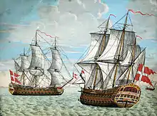 To danske orlogsskibe omkring 1750'erne. Forrest formodentlig linjeskibet Island, bagest et søsterskib.