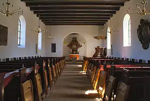 Kirkens indre afslører, at kirken har en ældre historie end dens ydre afslører. Her ses inventar af væsentlig større alder end den nuværende kirkebygning.