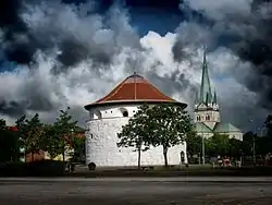 ![]() Krudttårnet i Frederikshavn med Frederikshavn Kirke i baggrunden | |