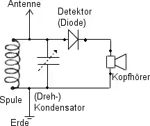 Svingningskredsen består af en kondensator – almindeligvis variabel – og en spole. Ved modtagelse af langbølgebåndet og mellembølgebåndet benyttes typisk en variabel kondensator på 500-50 pF og en af 2 spoler med en passende induktion så båndet dækkes.[3][4]